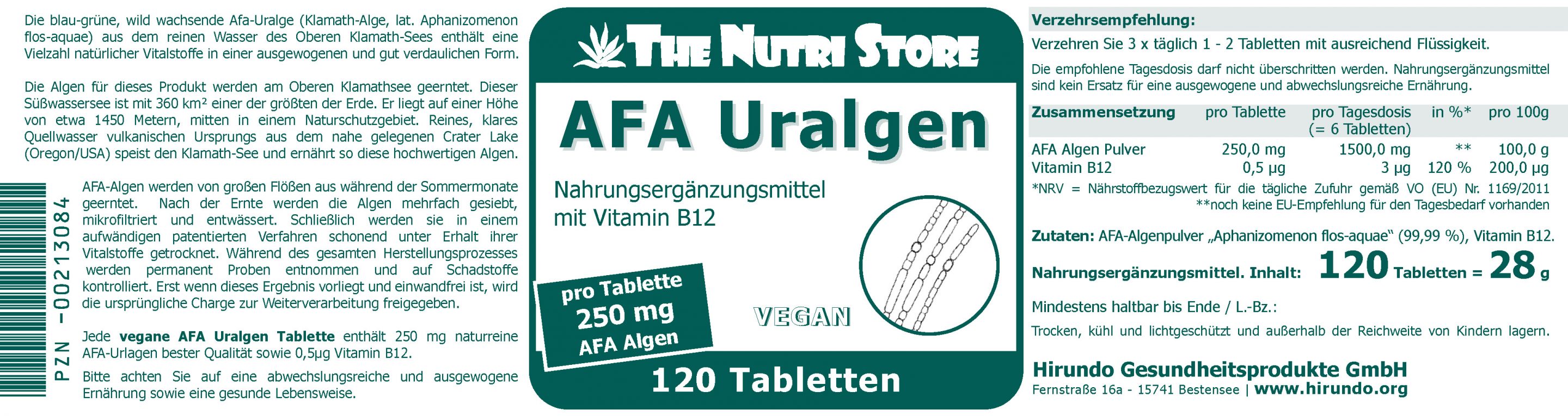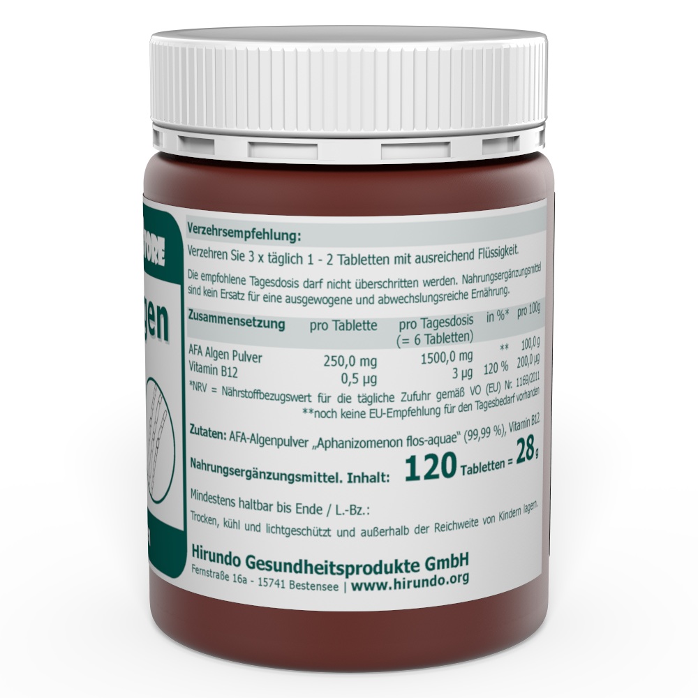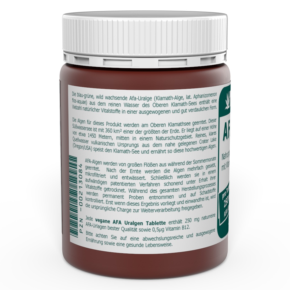 Jede vegane AFA Uralgen Tablette enthält 250 mg naturreine AFA-Urlagen bester Qualität sowie 0,5 µg Vitamin B12.