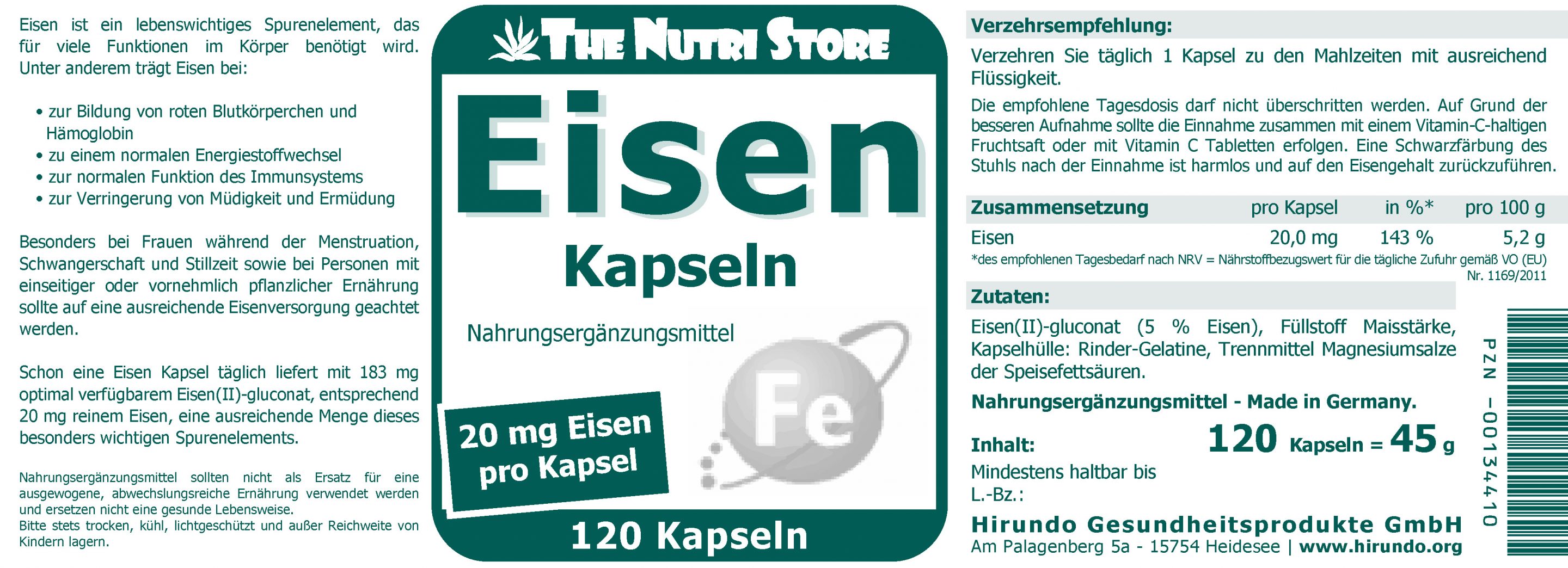 Zutaten: Eisen(II)-gluconat (5 % Eisen), Füllstoff Maisstärke, Kapselhülle: Rinder-Gelatine, Trennmittel Magnesiumsalze der Speisefettsäuren.