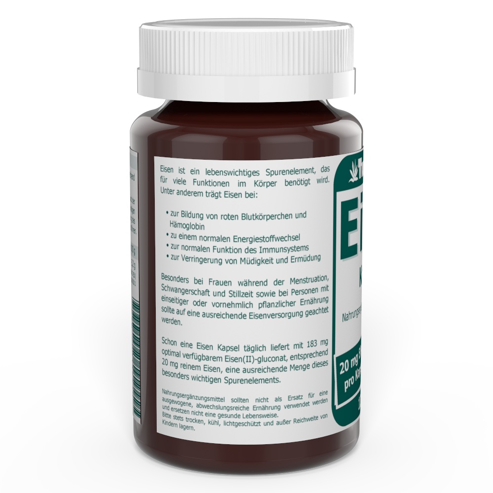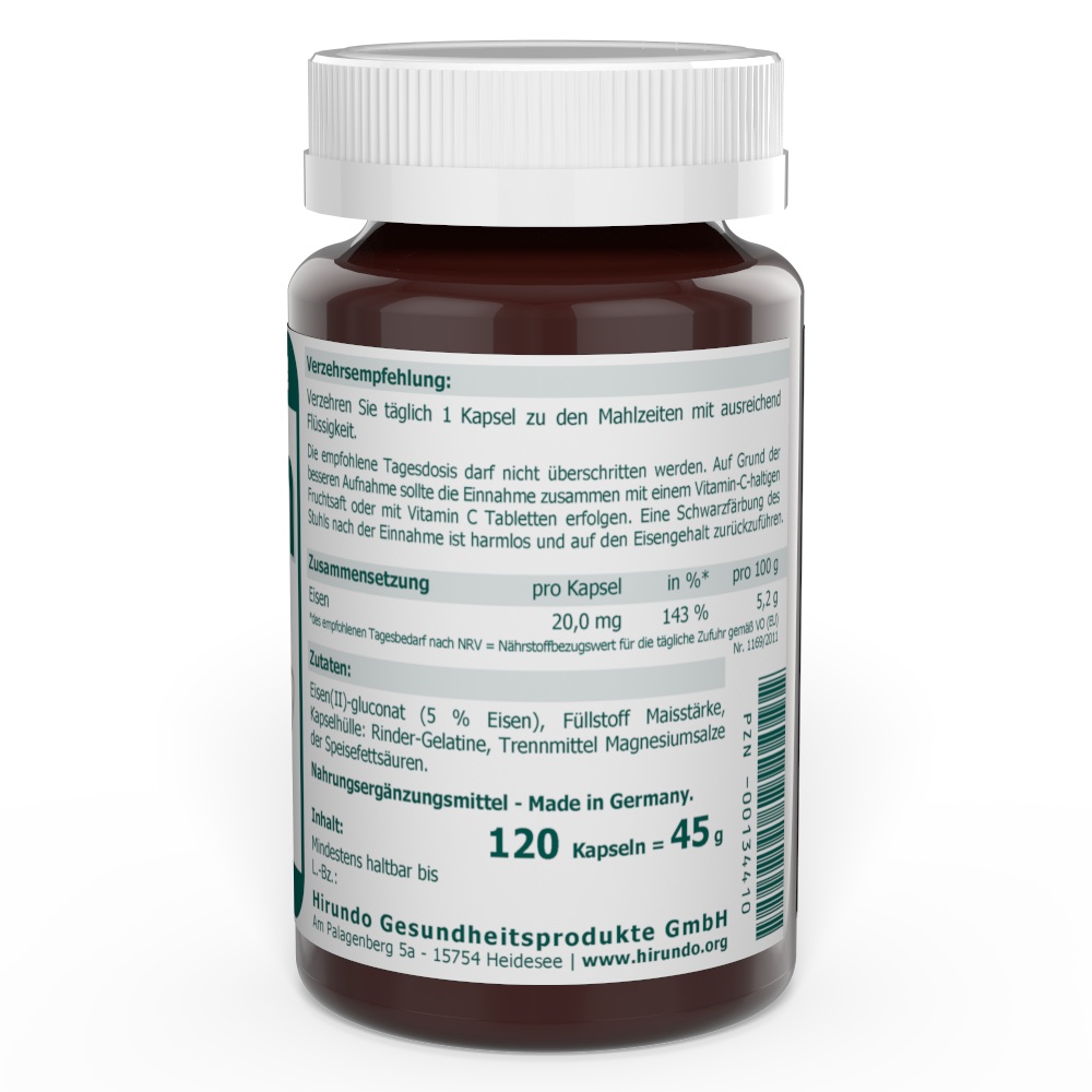 Schon eine Eisen Kapsel täglich liefert mit 183 mg optimal verfügbarem Eisen(II)-gluconat, entsprechend 20 mg reinem Eisen, eine ausreichende Menge dieses besonders wichtigen Spurenelements.