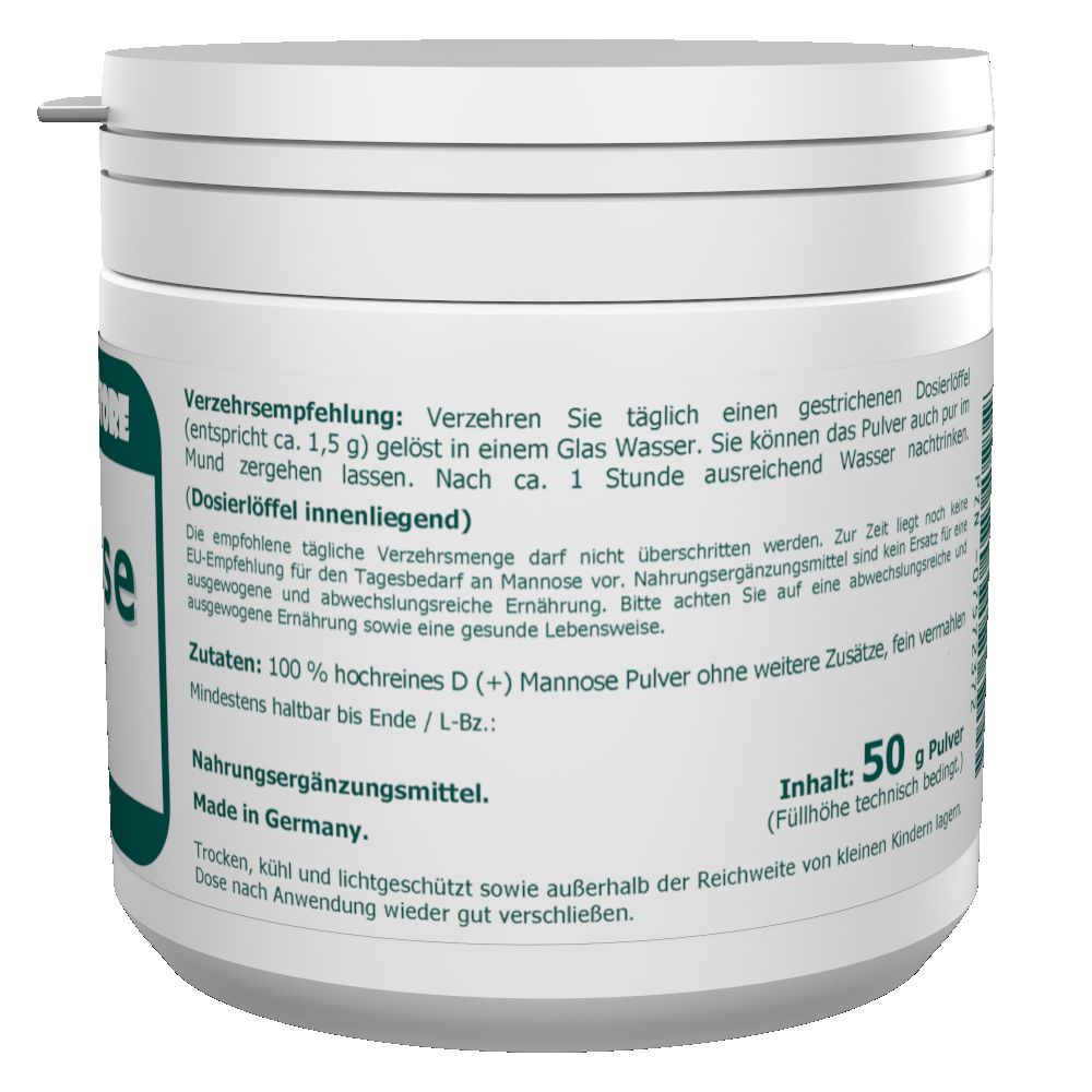 Die empfohlene tägliche Verzehrsmenge darf nicht überschritten werden. Zur Zeit liegt noch keine EU-Empfehlung für den Tagesbedarf an Mannose vor. Nahrungsergänzungsmittel sind kein Ersatz für eine ausgewogene und abwechslungsreiche Ernährung. Bitte achten Sie auf eine abwechslungsreiche und ausgewogene Ernährung sowie eine gesunde Lebensweise.
