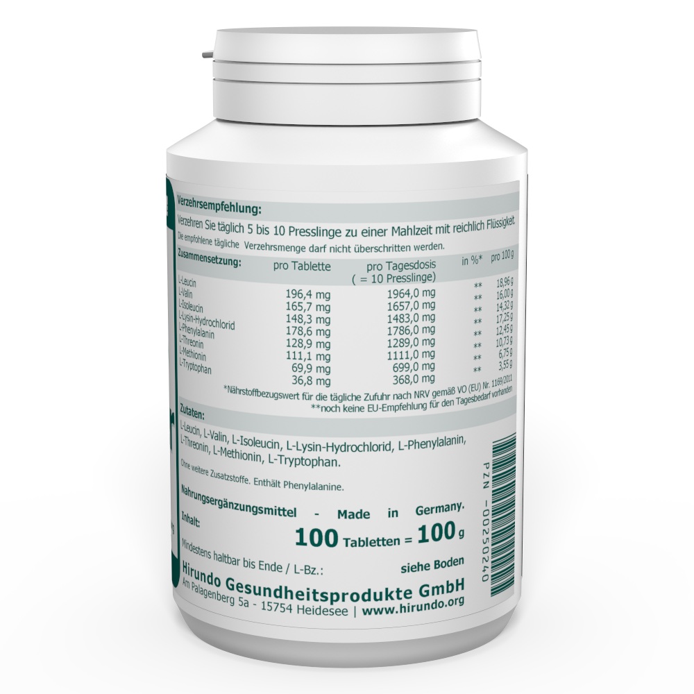 Zutaten: L-Leucin, L-Valin, L-Isoleucin, L-Lysin-Hydrochlorid, L-Phenylalanin, L-Threonin, L-Methionin, L-Tryptophan.
