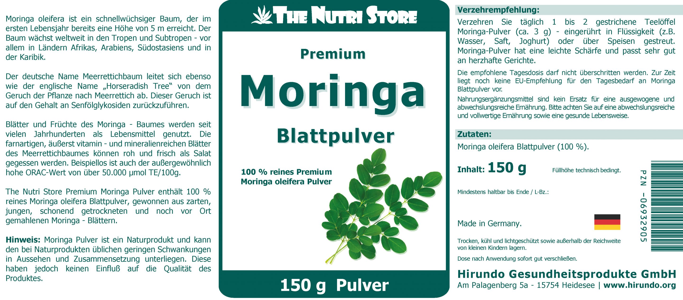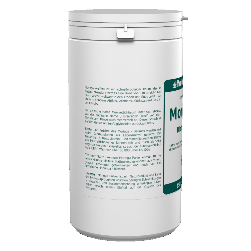 The Nutri Store Premium Moringa Pulver enthält 100 % reines Moringa oleifera Blattpulver aus Wildwuchs.
