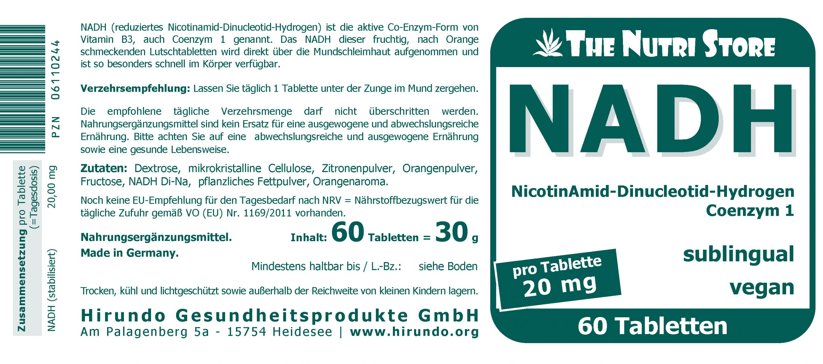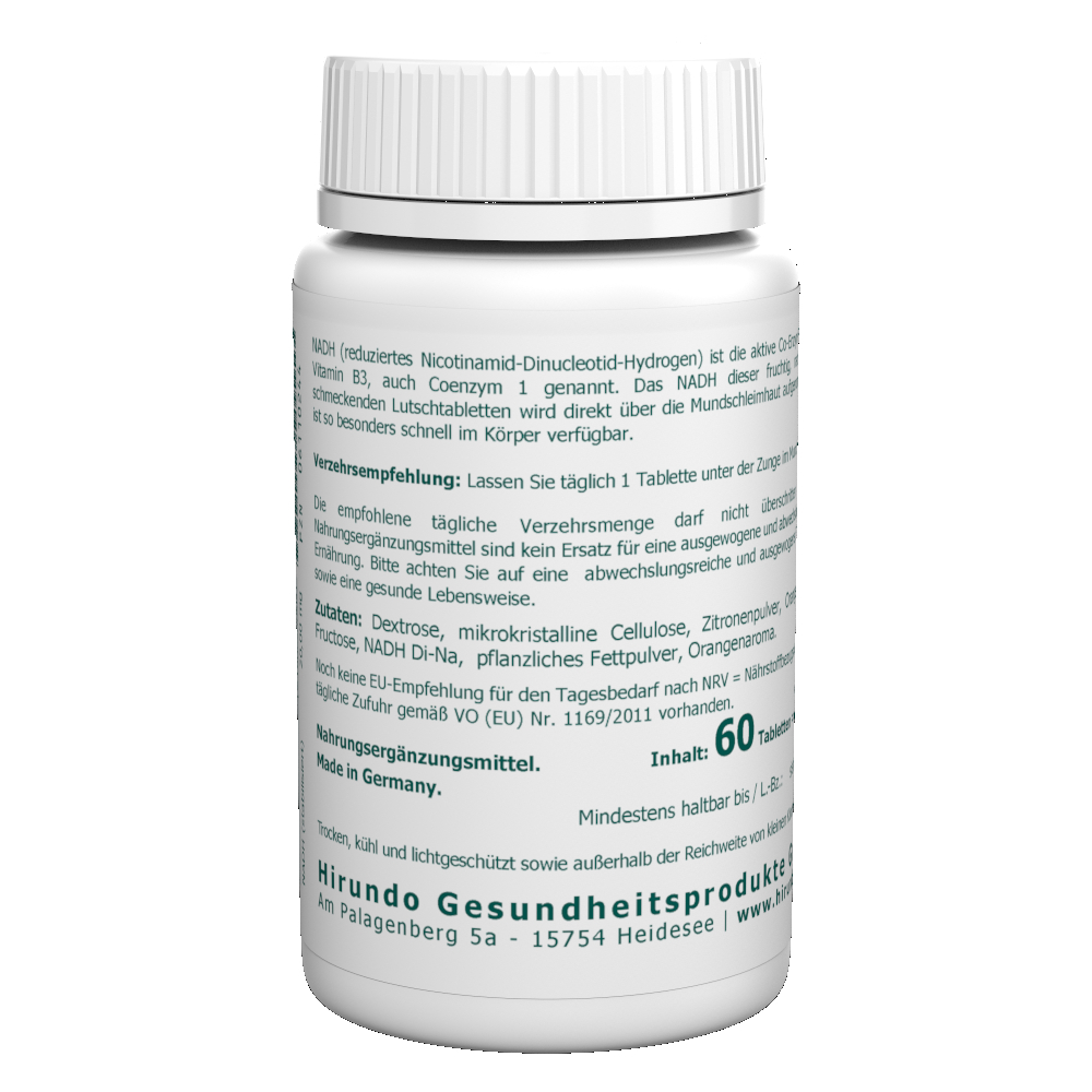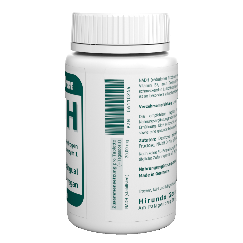 NADH (reduziertes Nicotinamid-Dinucleotid-Hydrogen) ist die aktive Co-Enzym-Form von Vitamin B3, auch Coenzym 1 genannt. Das NADH dieser fruchtig, nach Orange schmeckenden Lutschtabletten wird direkt über die Mundschleimhaut aufgenommen und ist so besonders schnell im Körper verfügbar.