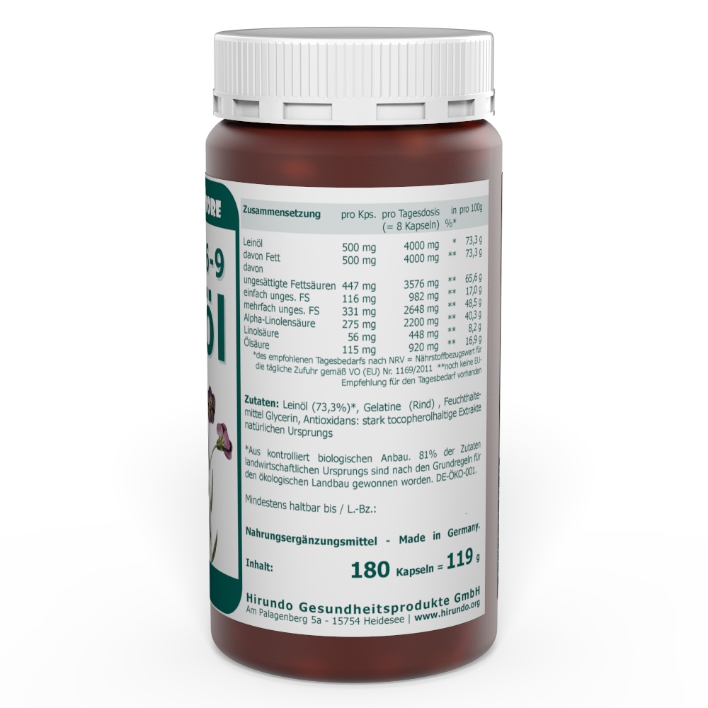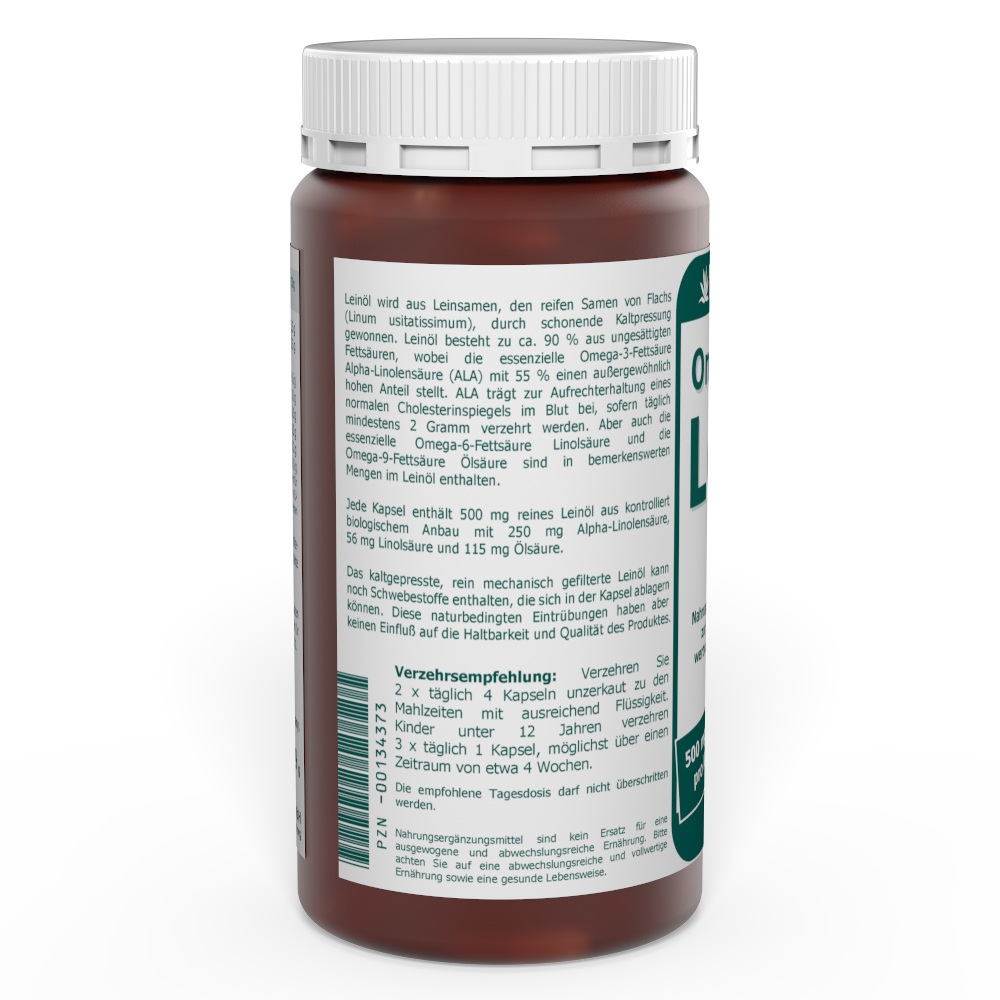 Jede Kapsel enthält 500 mg reines Leinöl aus kontrolliert biologischem Anbau mit 250 mg Alpha-Linolensäure, 56 mg Linolsäure und 115 mg Ölsäure. Das kaltgepresste, rein mechanisch gefilterte Leinöl kann noch Schwebestoffe enthalten, die sich in der Kapsel ablagern können. Diese naturbedingten Eintrübungen haben aber keinen Einfluß auf die Haltbarkeit und Qualität des Produktes.