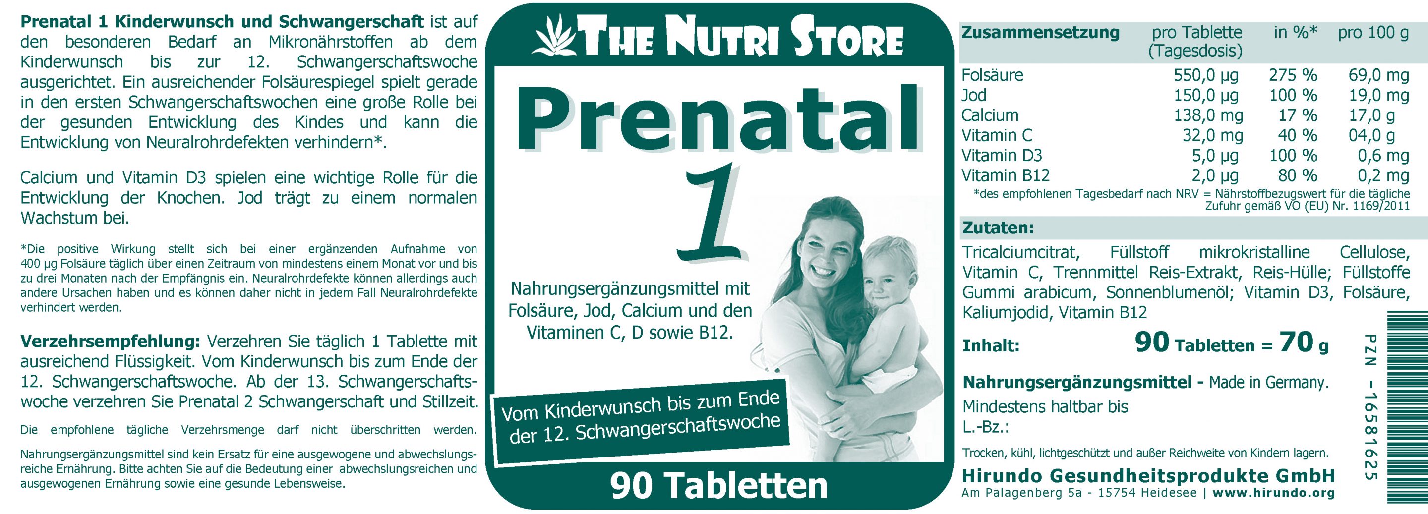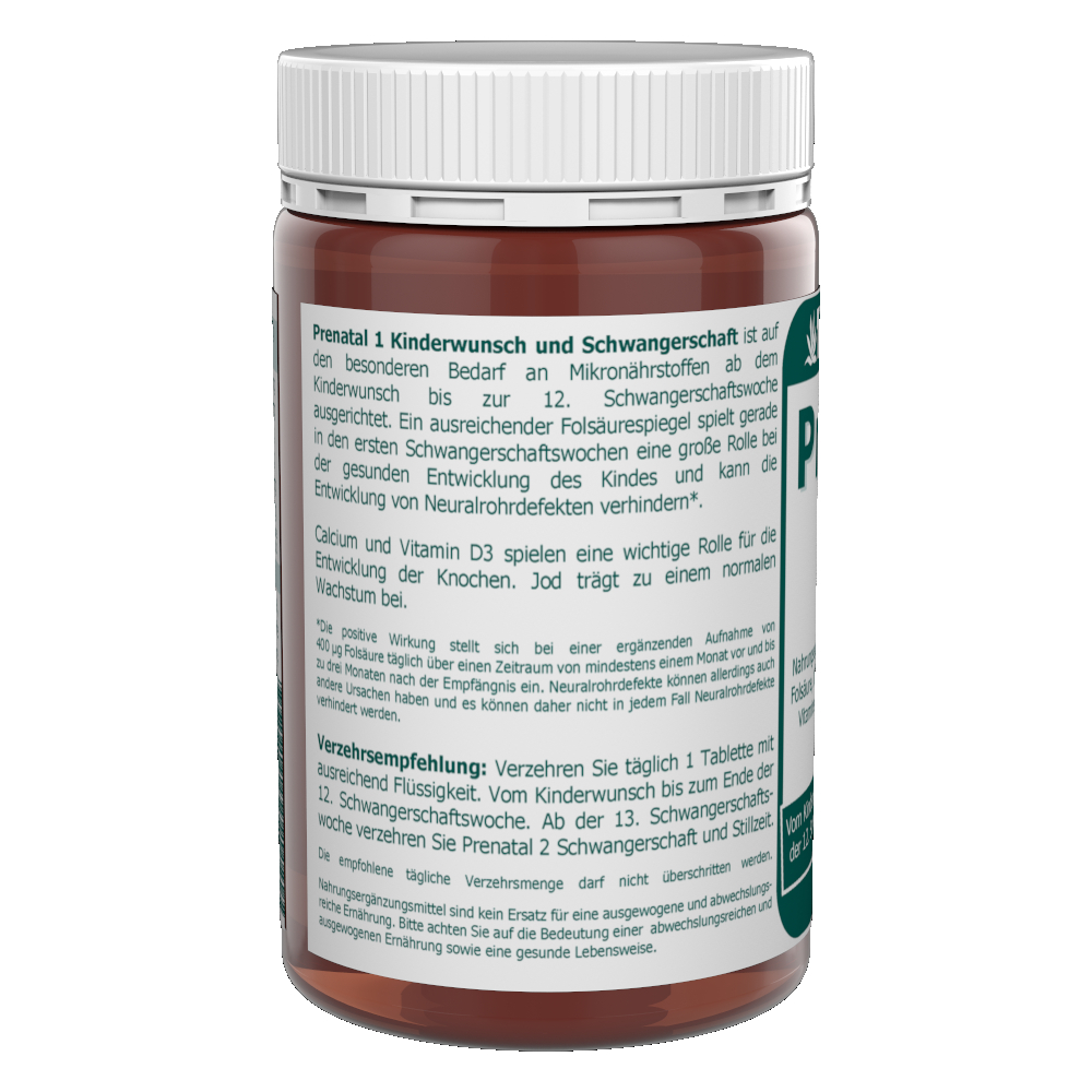 Prenatal 1 Kinderwunsch und Schwangerschaft ist auf den besonderen Bedarf an Mikronährstoffen ab dem Kinderwunsch bis zur 12. Schwangerschaftswoche ausgerichtet. Ein ausreichender Folsäurespiegel spielt gerade in den ersten Schwangerschaftswochen eine große Rolle bei der gesunden Entwicklung des Kindes und kann die Entwicklung von Neuralrohrdefekten verhindern*.