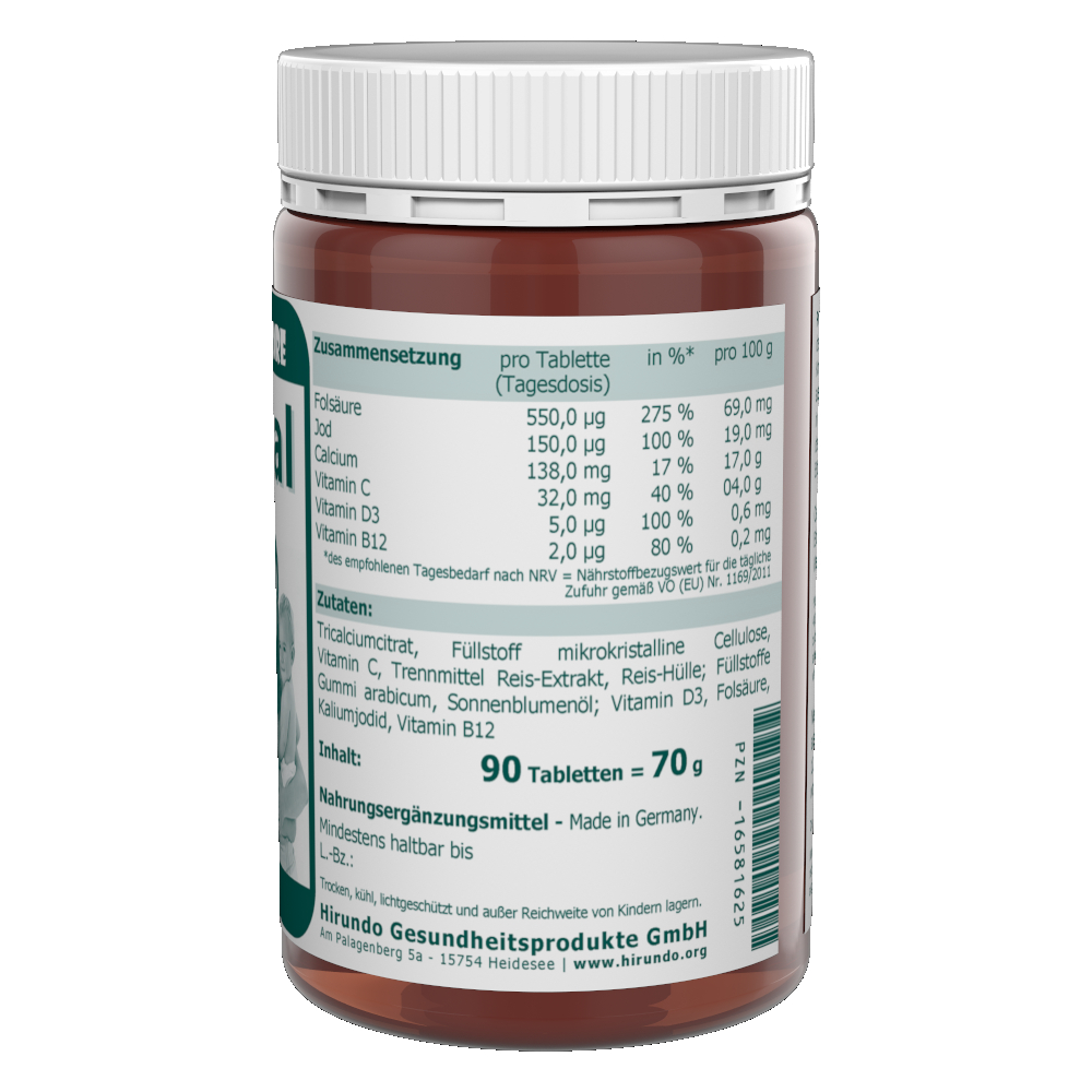 Zutaten: Tricalciumcitrat, Füllstoff mikrokristalline Cellulose, Vitamin C, Trennmittel Reis-Extrakt, Reis-Hülle; Füllstoffe Gummi arabicum, Sonnenblumenöl; Vitamin D3, Folsäure, Kaliumjodid, Vitamin B12
