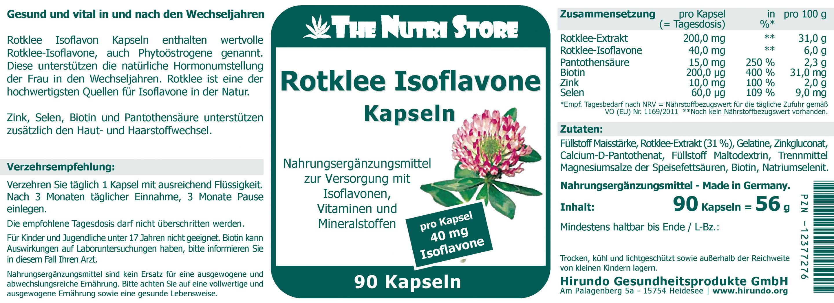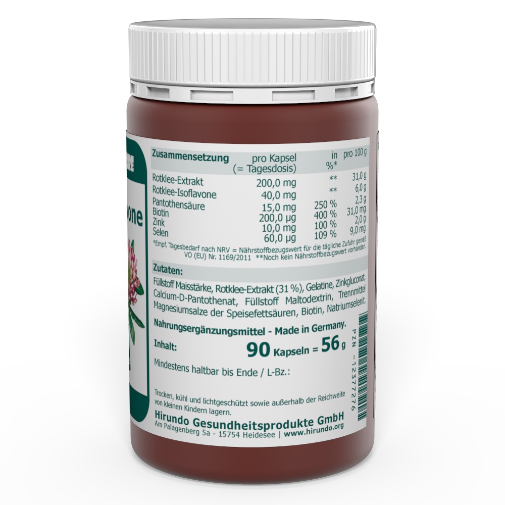 Zutaten: Füllstoff Maisstärke, Rotklee-Extrakt (31 %), Gelatine, Zinkgluconat, Calcium-D-Pantothenat, Füllstoff Maltodextrin, Trennmittel Magnesiumsalze der Speisefettsäuren, Biotin, Natriumselenit.