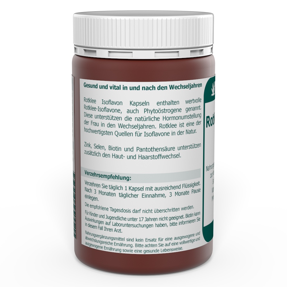 Rotklee Isoflavon Kapseln enthalten wertvolle Rotklee-Isoflavone, auch Phytoöstrogene genannt. Diese unterstützen die natürliche Hormonumstellung der Frau in den Wechseljahren. Rotklee ist eine der hochwertigsten Quellen für Isoflavone in der Natur.