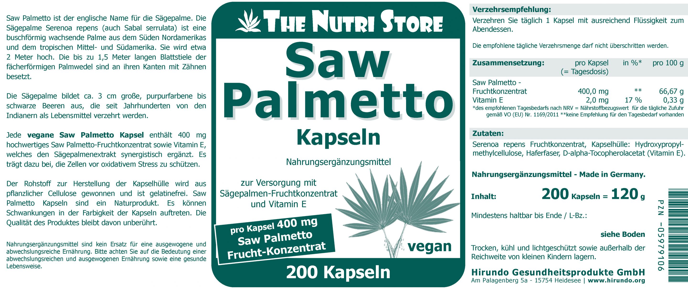 Der Rohstoff zur Herstellung der Kapselhülle wird aus pflanzlicher Cellulose gewonnen und ist gelatinefrei. Saw Palmetto Kapseln sind ein Naturprodukt. Es können Schwankungen in der Farbigkeit der Kapseln auftreten. Die Qualität des Produktes bleibt davon unberührt.