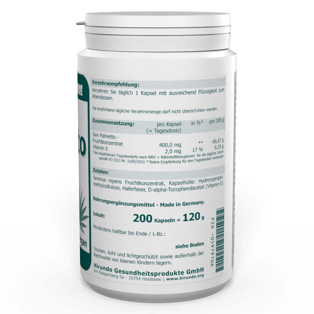 Zutaten: Serenoa repens Fruchtkonzentrat, Kapselhülle: Hydroxypropylmethylcellulose, Haferfaser, D-alpha-Tocopherolacetat (Vitamin E).